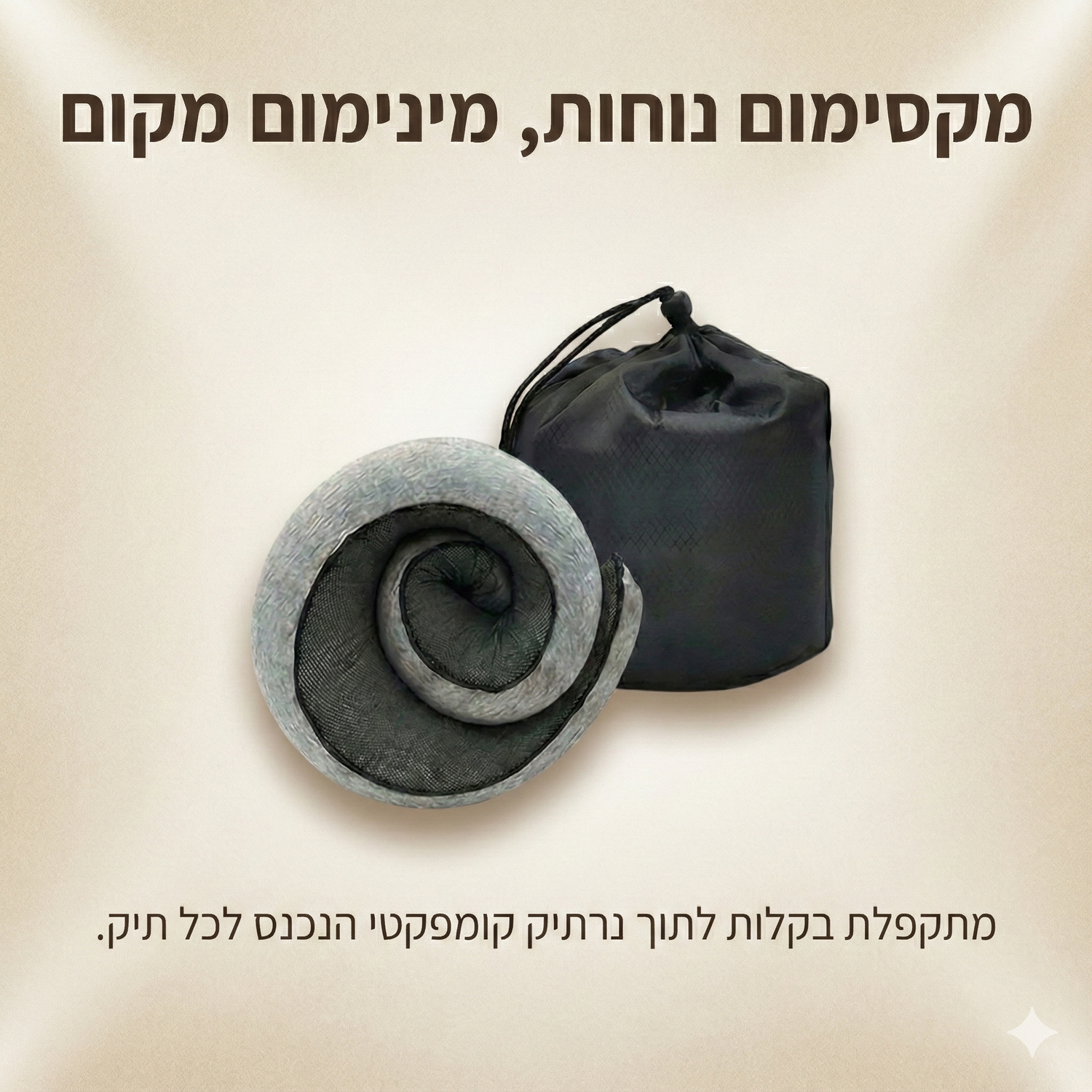 רוב כריות הטיסה האיכותיות הן גדולות, מסורבלות ותופסות חצי מזוודה. הכרית שלנו עשויה מספוג זיכרון חכם שמתכווץ ל-1/3 מהגודל שלו. פשוט מגלגלים, מכניסים לנרתיק, ותולים על התיק. הכי קל שיש.